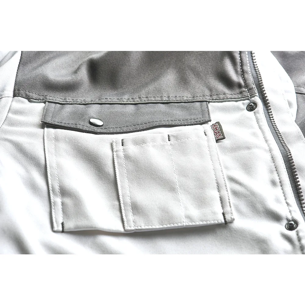Unsere preiswerte Arbeitskleidung für den Trockenbau und die Malerei zeigt sich in der klassischen Farbkombination Weiß/Graphitgrau. Das Weiß der Kleidung lässt sich harmonisch mit graumelierten und/oder graphitgrauen Shirts und Sweatern kombinieren. Die Kleidung bietet ausreichend Taschen zum Verstauen verschiedener Utensilien. Sie ist strapazierfähig, leicht zu reinigen und dank des leichten Mischgewebes angenehm zu tragen.